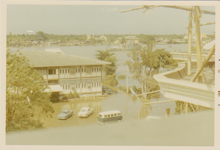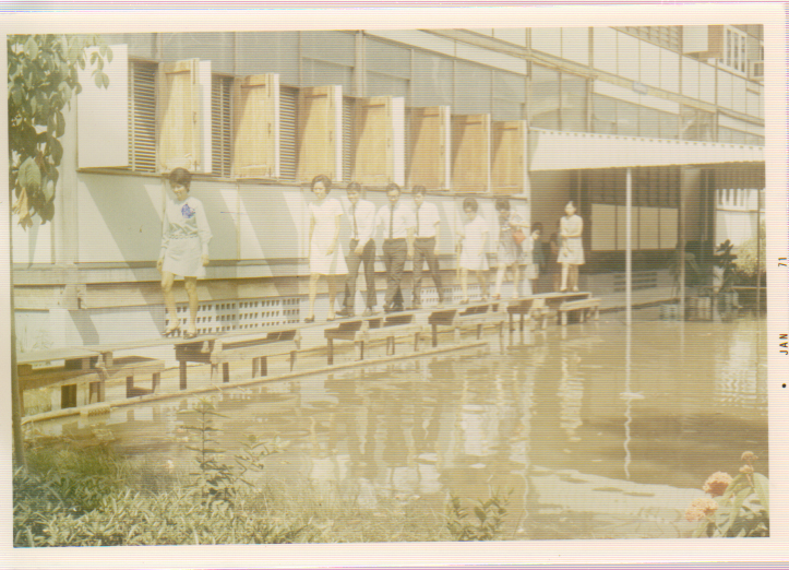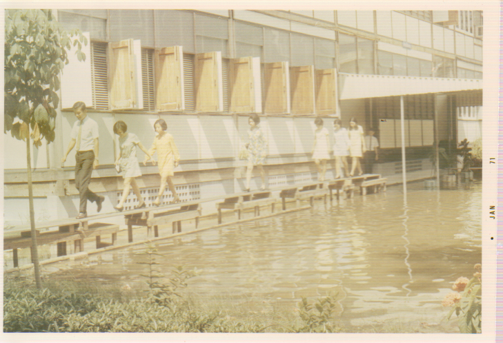 น้ำท่วมบริเวณที่ทำการธนาคารแห่งประเทศไทย พ.ศ.2513 ในภาพคือ อาคารและพนักงานฝ่ายวิชาการ (อาคารเรือนไม้ชั่วคราว) โดยผู้หญิงชุดสีเหลืองที่เดินนำหน้าคือ คุณชฎา กฤษณามระ (ขณะนั้น)