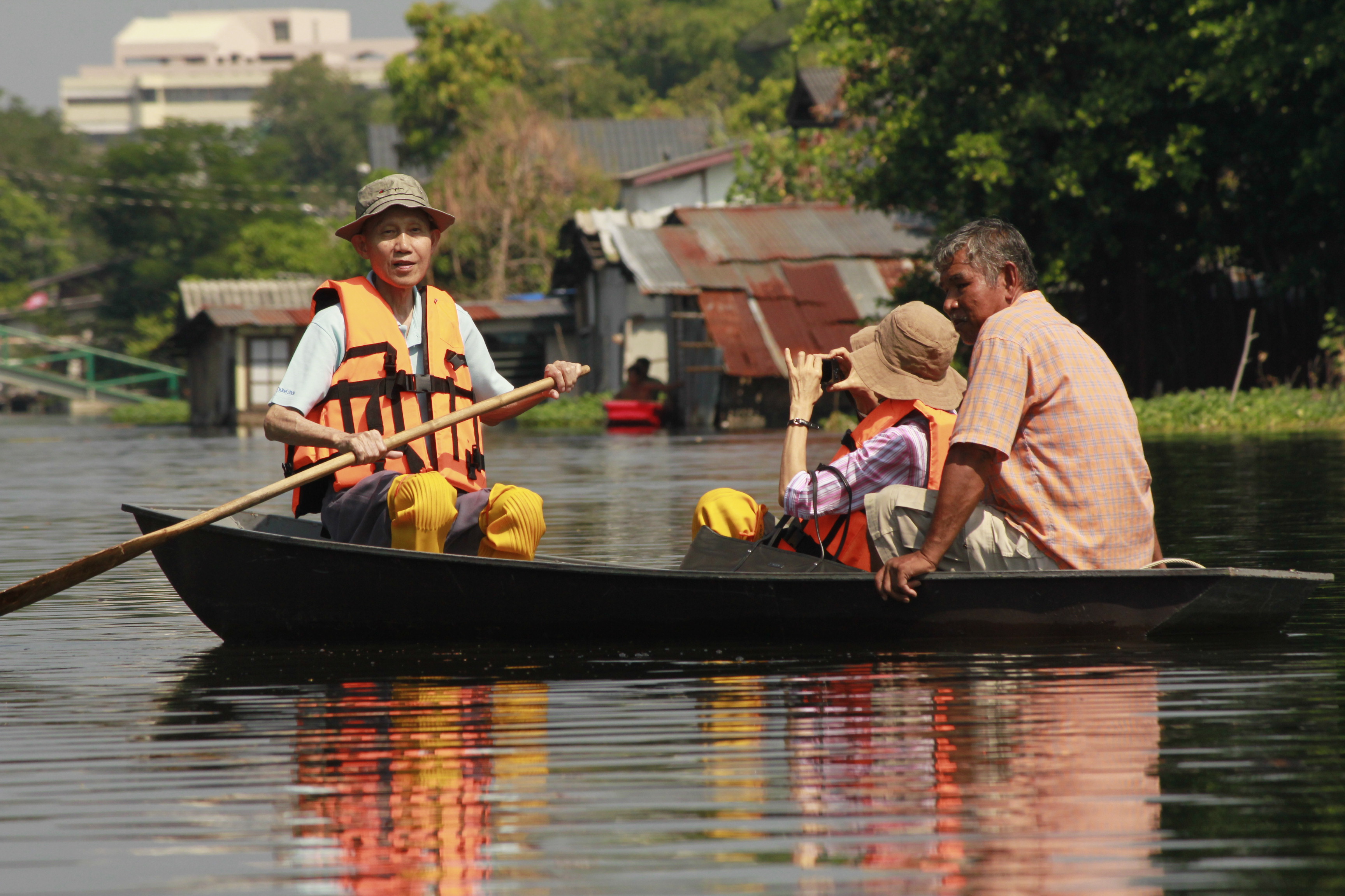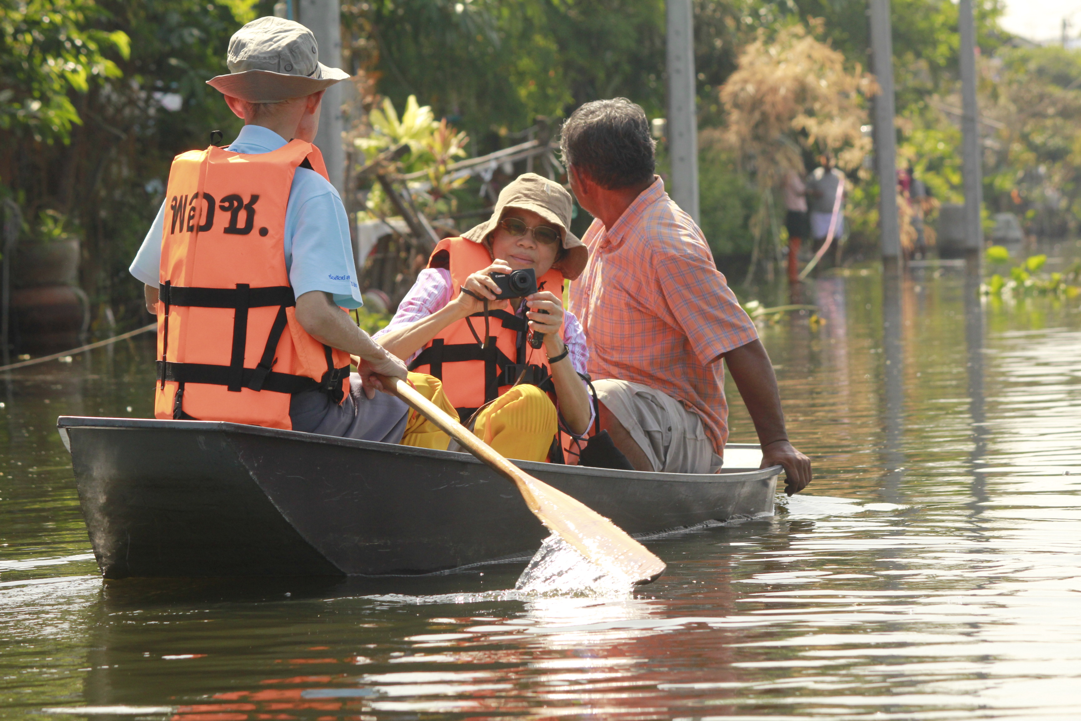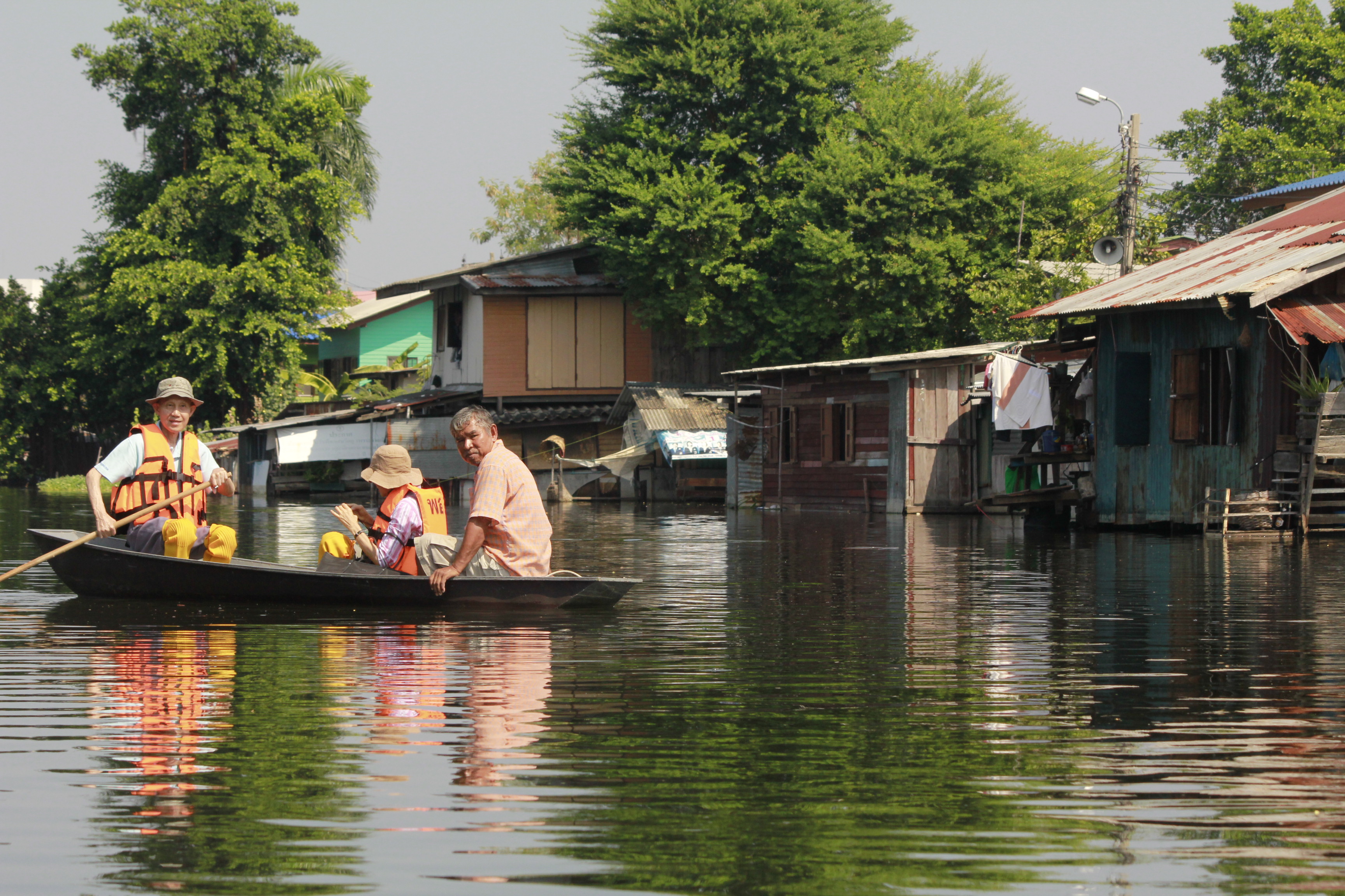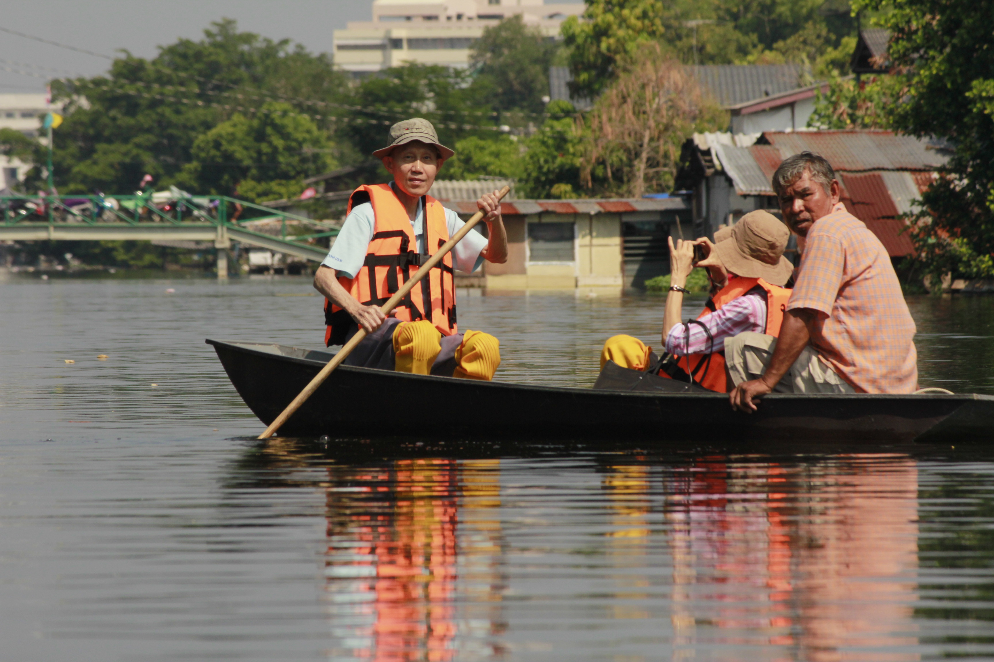 อ.ไพบูลย์ วัฒนศิริธรรม ในฐานะประธานมูลนิธิหัวใจอาสา พร้อมด้วยคุณหญิงชฎา วัฒนศิริธรรม ผู้นำชุมชนตำบลท่าอิบุญ อ.หล่มศักดิ์ จ.เพชรบูรณ์ นางทิพย์รัตน์ นพลดารมย์ ผู้อำนวยการ พอช. และเจ้าหน้าที่สถาบันพัฒนาองค์กรชุมชน (องค์การมหาชน) หรือ พอช. เยี่ยมให้กำลังใจชาวชุมชนบางบัว เขตบางเขน กรุงเทพมหานคร ในเหตุการณ์มหาอุทกภัย โดยนำกระแสพระราชดำรัส "เศรษฐกิจพอเพียงจะช่วยให้โลกพ้นวิกฤตได้" พร้อมด้วยหนังสือ-บทความเกี่ยวกับการจัดการภัยพิบัติ การป้องกันและการเตรียมรับมือ แพไม้ไผ่ น้ำดื่ม และอีเอ็มบอล ไปมอบให้ด้วย