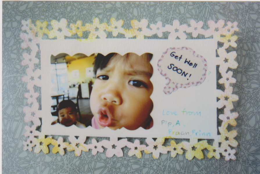 ชมพรรณ กุลนิเทศ (ลูกสาว), ณัฐวุฒิ กุลนิเทศ (เขย), ด.ญ.นัทธมน และ ด.ช.นนทพัทธ์ กุลนิเทศ (หลานตา) ทำบัตรอวยพร (Get Well Soon Card)เพื่อให้กำลังใจและขอให้อาจารย์ไพบูลย์ วัฒนศิริธรรม หายจากอาการป่วย ระหว่างเข้ารับการรักษามะเร็งลำไส้